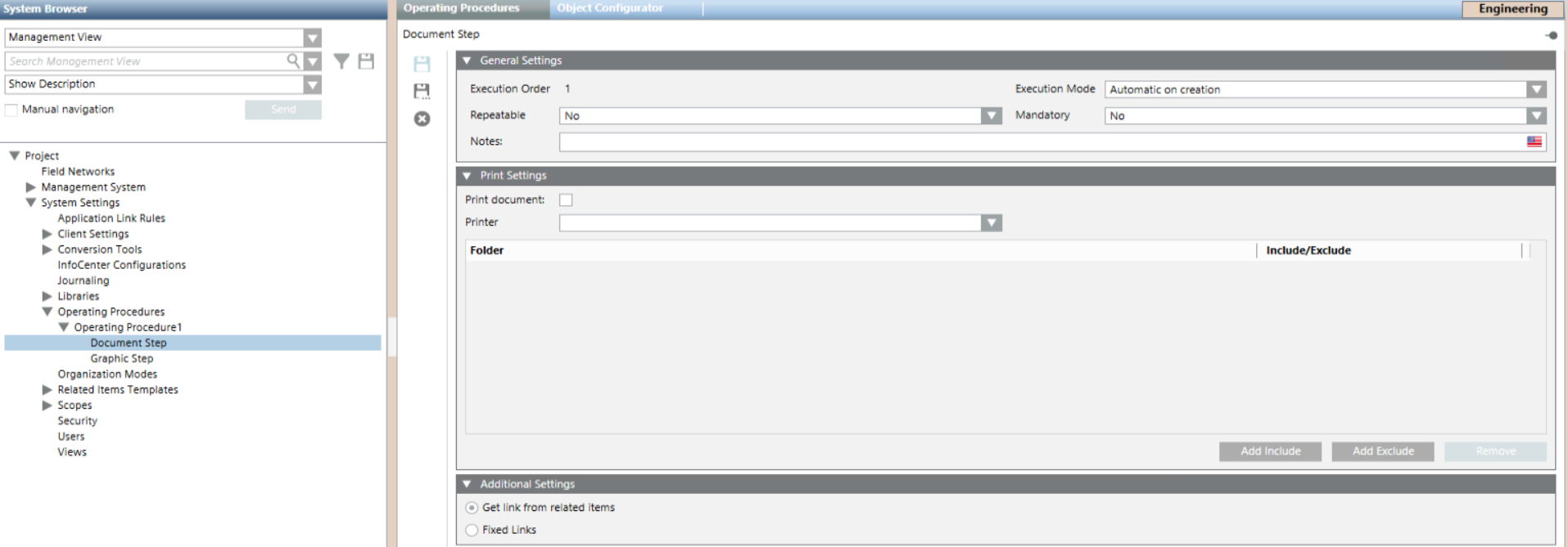 When you configure an operating procedure and select a procedure step in System Browser, a workspace displays where you can configure the settings for that step.