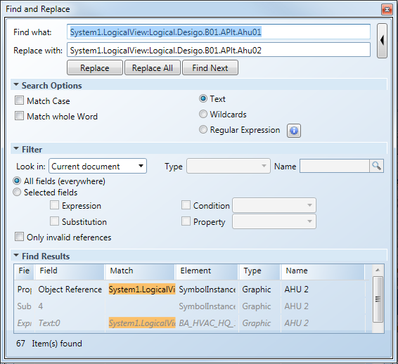 For example, System1.LogicalView:Logical.Desigo.B01.APlt.Ahu02. - Apply the default settings for the Find what and Replace with fields.