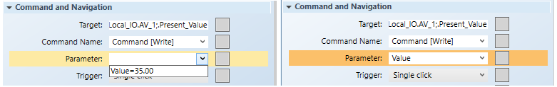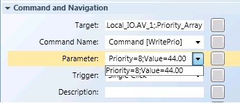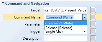 - Command with multiple command parameters across different command controls. For example, a Numeric control for the Value; a Numeric control for the Priority, and a Send button to command your Priority Array property. A user edits the value of all the parameters individually and then sends the command with all the values using a Send button.