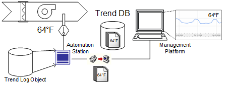 | Trend data is saved locally to the Trendlog object in the automation station. |