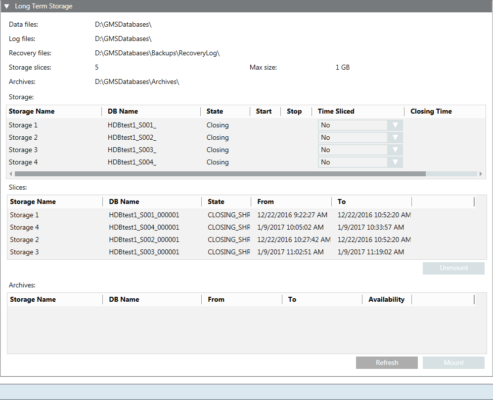 Storage slices | The number of storage slices the long term storage has (max. 10). When this number is reached, the oldest storage slice is archived. NOTE: This number only includes slices in final state. Spare, current or archived slices are not included in the number. |