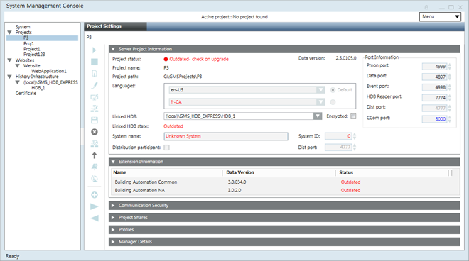 Unknown system(in red) and System ID as0(displays in red) indicates that the restored project has an older data version than the current Desigo CC data version. The system name and system ID of the restored project are displayed on upgrade.