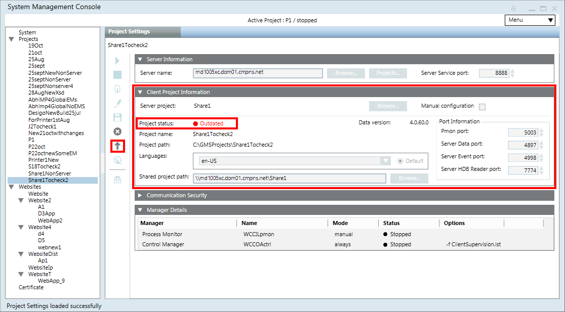 If Server Project Information expander still displayOutdated(in red), then select corresponding main project node to refresh the project status. - System name displays as