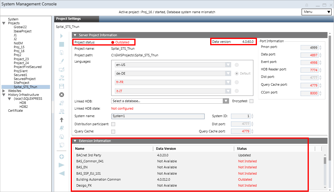 If machine name is changed then system name is displayed in red, and you need to update Project. Internally the pmon user and HDB user is synced, and you need to create a new certificate, import it and set as default certificate. - Languages: The language which is not installed but was configured in the project that you restored displays in red. You must install this language pack. Although such a project can run properly, it is still recommended that you install the missing language packs. For all missing languages, the localization files cannot be imported during Add to Project and Upgrade Project workflows. In this case, a warning trace is added to the Smc.log file located at