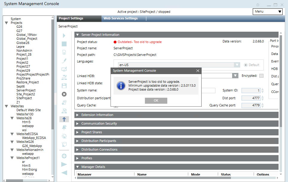 For Windows user you do not need to change the old password while logging on to the Installed Client. - In the Server Project Information expander of the Project Settings tab, you may observe the following before upgrading the project: