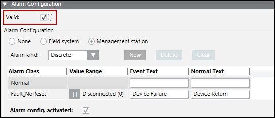 - In the Alarm Configuration expander, deselect the Valid flag in the Valid check box to configure your own Alarm Class to suppress the manual intervention.