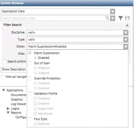 - In System Browser, select the system subtree for which you want to enable alarm suppression.