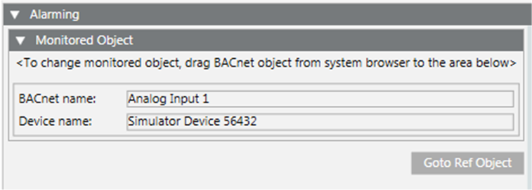 Monitored Object | To change the monitored object, drag the BACnet object from the System Browser to this section. The BACnet name and Device name for the object displays in the list. If you drag a new object into this section, the monitored object reference is replaced, and the Event Parameter information in the Definitions expander is replaced with the default type for the new object. NOTE: You cannot drag an event enrollment object or multiple instances of the same object into this section. |