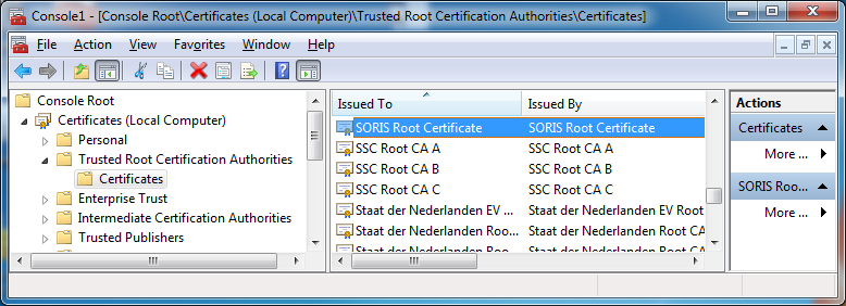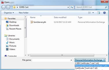 - You want to install the SORISRootCert.cer file and the SORISServerCert.pfx file to the Microsoft Management Console.