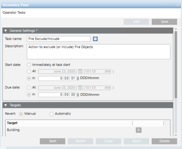 - The task editing fields display in the Secondary pane. In the Targets expander, the target is automatically set based on the selected object. In this example, Building.