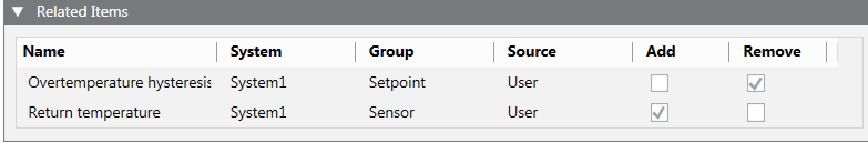- In the Related Items expander, the Add and Remove columns display next to each related item of the first object.