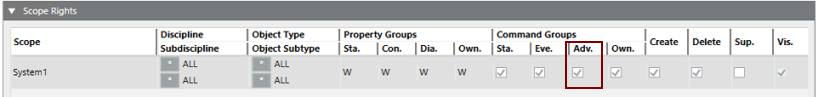- In the Scope Rights expander, under Command Groups, clear the Adv. flag.
