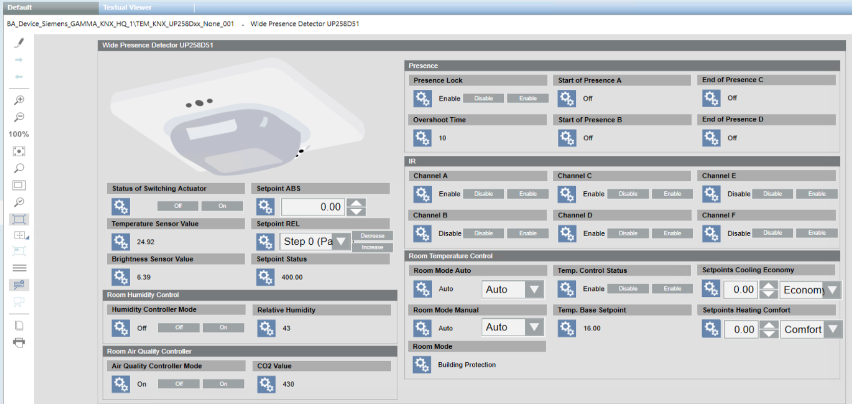 In Engineering mode, this is the graphic template for the UP 258D31, UP 258D41, UP 258D51, and UP 258D61 presence detectors.