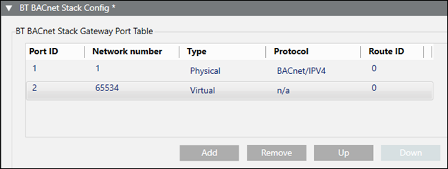 Route ID | Displays when the BACnet/SC protocol is selected in the port table. Used to control network communication. By default, all network connections have the same ID. This means devices on two different networks with the same Route ID, for example, can communicate with each other and with the management station through the BACnet driver, which acts as a router to connect the networks. If network connections do not have the same ID, the BACnet driver will not act as a router. This means the two networks can only communicate with the management station but not with each other. This scenario can be useful for isolating a fire network from a building control network. |