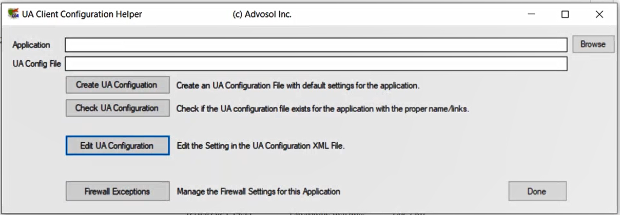 - The UA Client Configuration Helper dialog box displays on the screen.