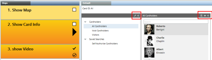 These include, for example, the command icons in the headers used to switch between list and table view, filter cardholders, create and delete search views, show/hide columns, and so on.