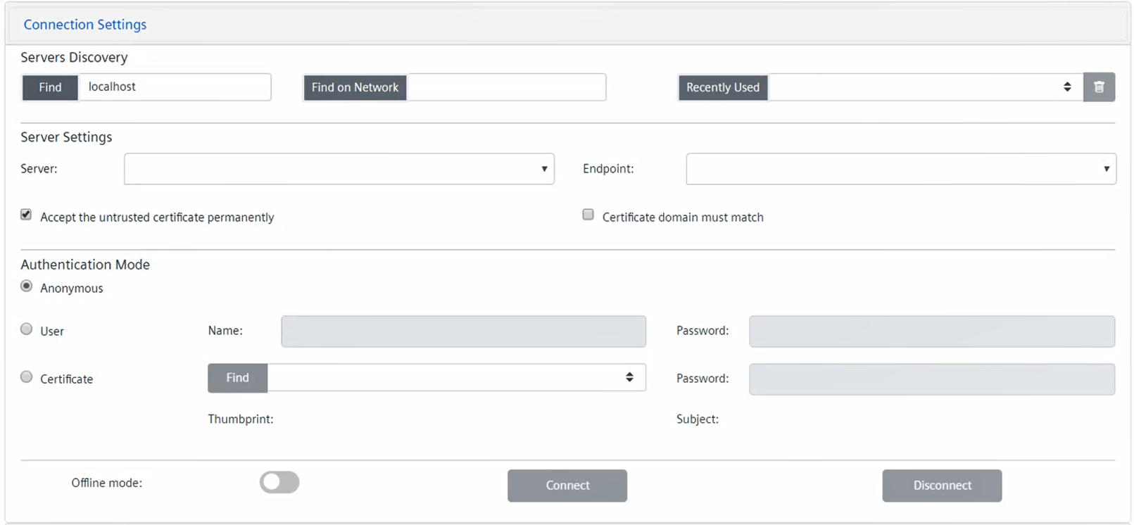 - To discover OPC UA third-party servers locally, enter the name or address of the remote machine, and click Find.