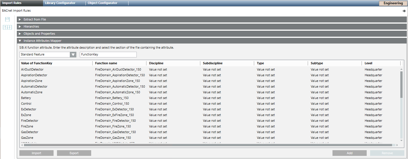- Select Project > System Settings > Libraries > L1 Headquarter > BA > Device > BACnet > Import rules.