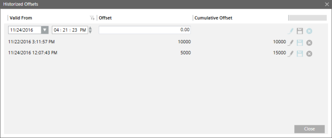 The Historized Offsets dialog box allows you to manually historize the offset value.