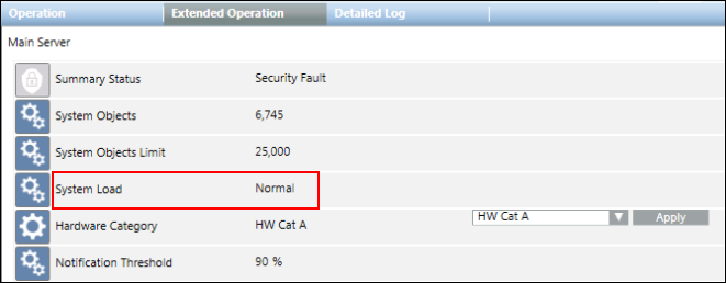 If the number of IEC61850 objects is below both the system limits (defined by the System Objects Limit property) and the safety threshold (defined by the Notification Threshold property), then the System Load property indicates Normal and displays in the Extended Operation tab only.