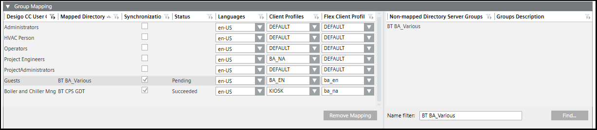 (Optional) Manual assignment procedure: a. Select the LDAP tab and open the Group Mapping expander. b. In the Name filter field, enter a group name. You can use an asterisk (*) as a wild card at the end of the filter name, for example, CH DEV1*. In a large system, avoid using an asterisk at the beginning of the search phrase because it can result in excessive search times. c. Click Find. The groups display in the Non-mapped Directory Server Groups list. d. Note down the name of the domain group that you want to assign. You will have to enter it in step 6.