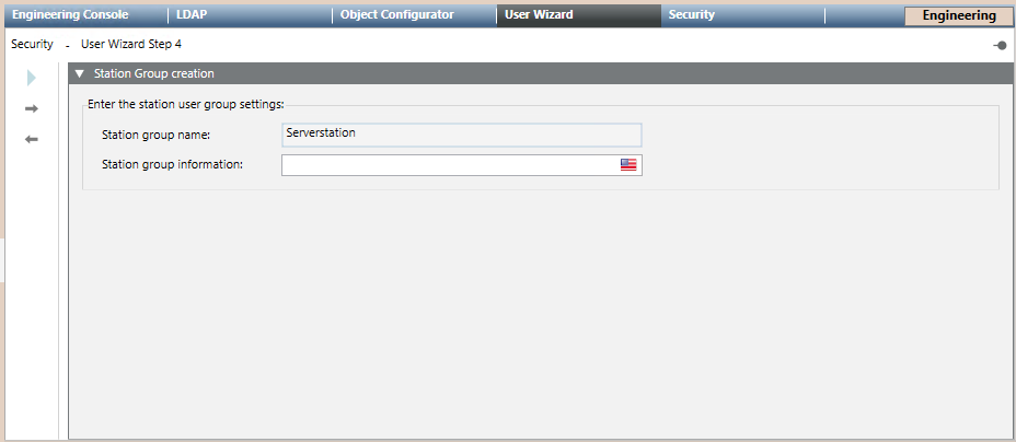 Enter the Station Group InformationYou are in the User Management Wizard step 4 – Station group creationEnter the Station group name. The name must be unique.Click .