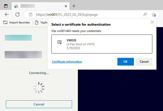 NOTE: The URL is the one that was configured for the Flex Client application in SMC. - In the Select a Certificate dialog box, select the host certificate of the identified Flex client and click OK.