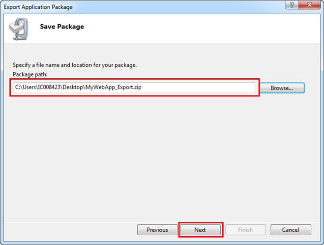 NOTE: The Export Application menu displays only if you have installed Web Deploy. - The Export Application Package window displays.