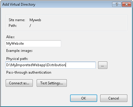 b. Physical Path as the local path of the Distribution folder of the web application on the target machine for example …\[Web application name]\Distribution.