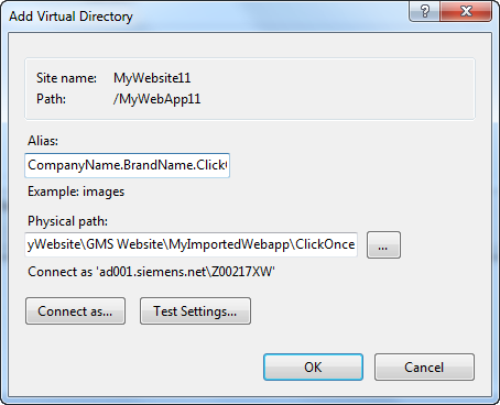 - In the Add Virtual Directory dialog box, click Test Settings to open the Test Connection dialog box.