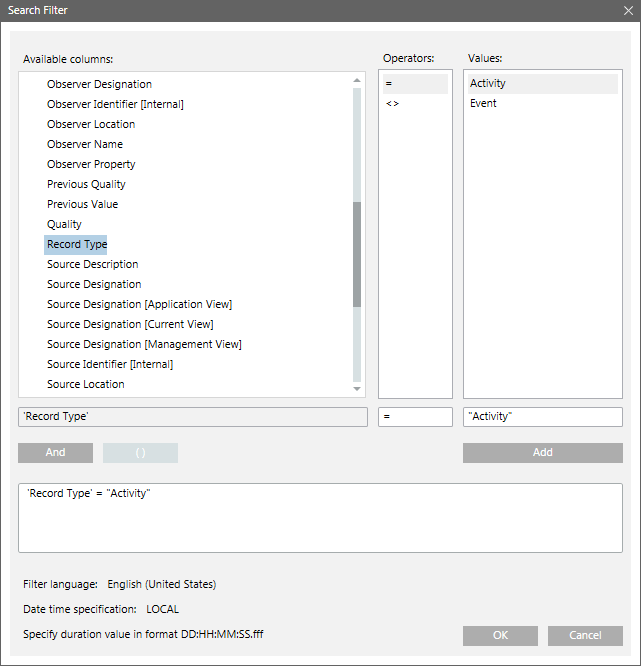And | This is a logical operator that allows you to combine filter expressions and create complex filters. This button is unavailable until a filter expression is added to the Filter expression field. |