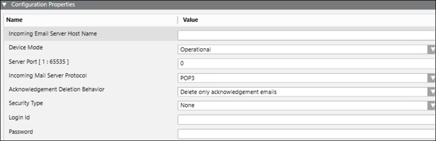 In the Configuration Properties expander, configure the parameters for Incoming Email Serveras stated below: