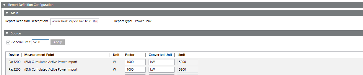 Enter values into the following columns: a. Select the required measurement point for which the report needs to be generated from the drop-down list under the Measurement Point column. b.Unit c.Factor d.Converted Unit e.Limit