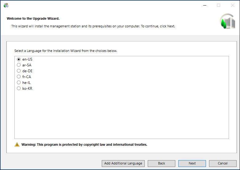 Desigo CC Upgrade Wizard dialog box displays, with the default selection as the en-US language or the current OS language. It also lists all the languages whose language packs are valid and available at the path