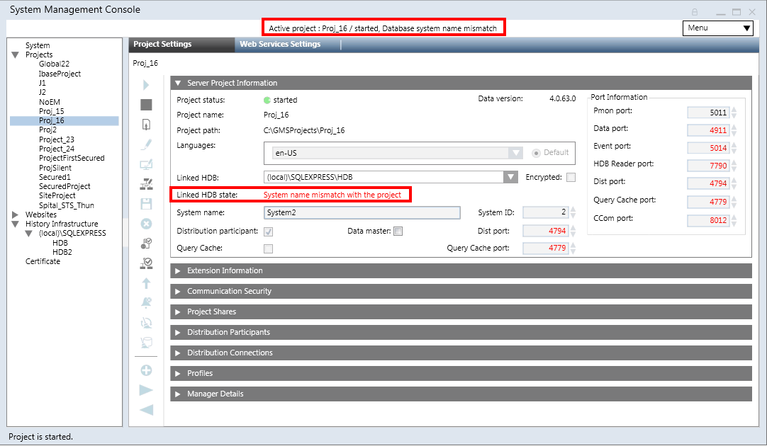 If you start a project whose database was corrupted, and the SMC is still internally repairing the database when the startup timeout elapses, the project status will be indicated as running - incomplete. In this case, it is recommended to wait until the database repair is complete and the project status changes to started. However, you can also stop the project.