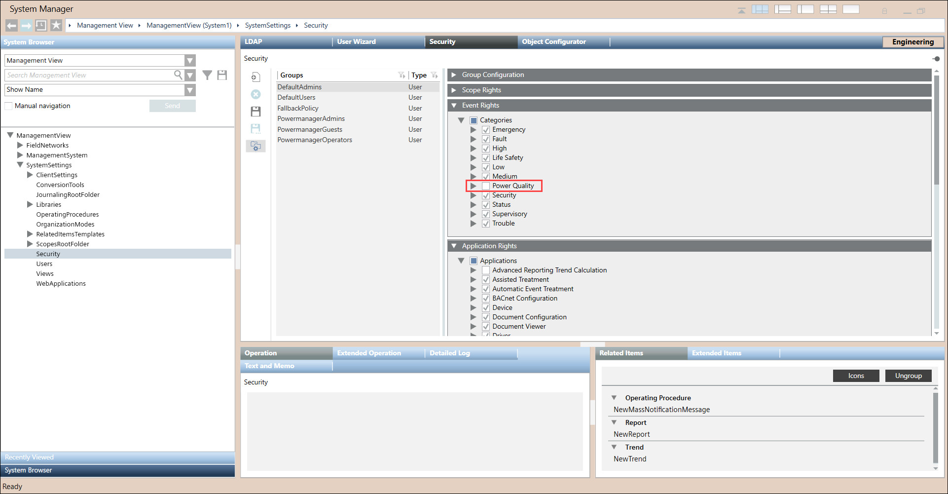 - Open Powermanager and navigate to Management View > SystemSettings > Security > Security tab > Event Rights expander > Power Quality.